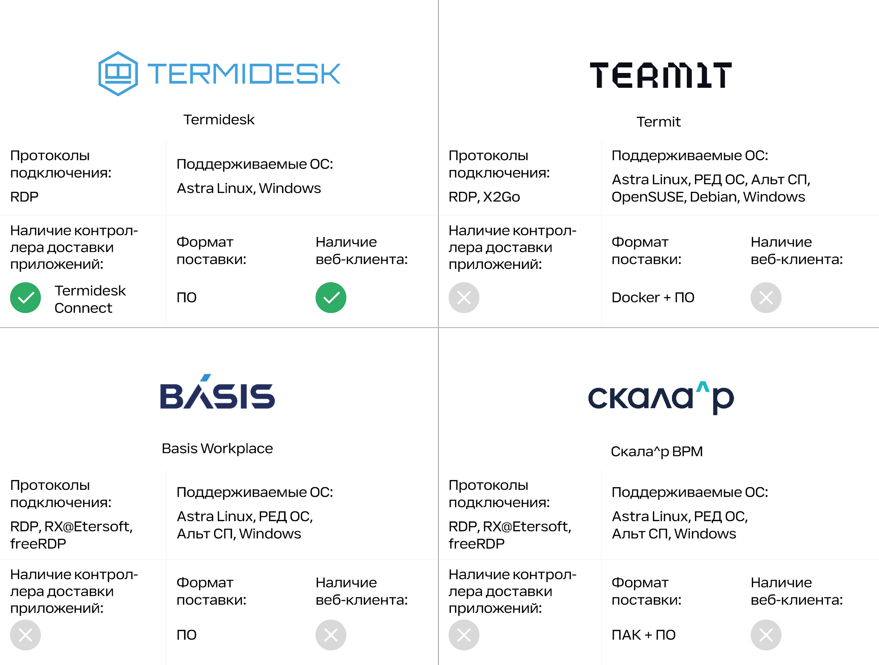 Особенность рассматриваемых решений — использование компонентов Microsoft RDS для доставки рабочих столов и приложений Windows. Для Linux продукты Termit и Termidesk используют компоненты собственной разработки, а Скала^р ВРМ и Basis Workplace — сторонние составляющие.