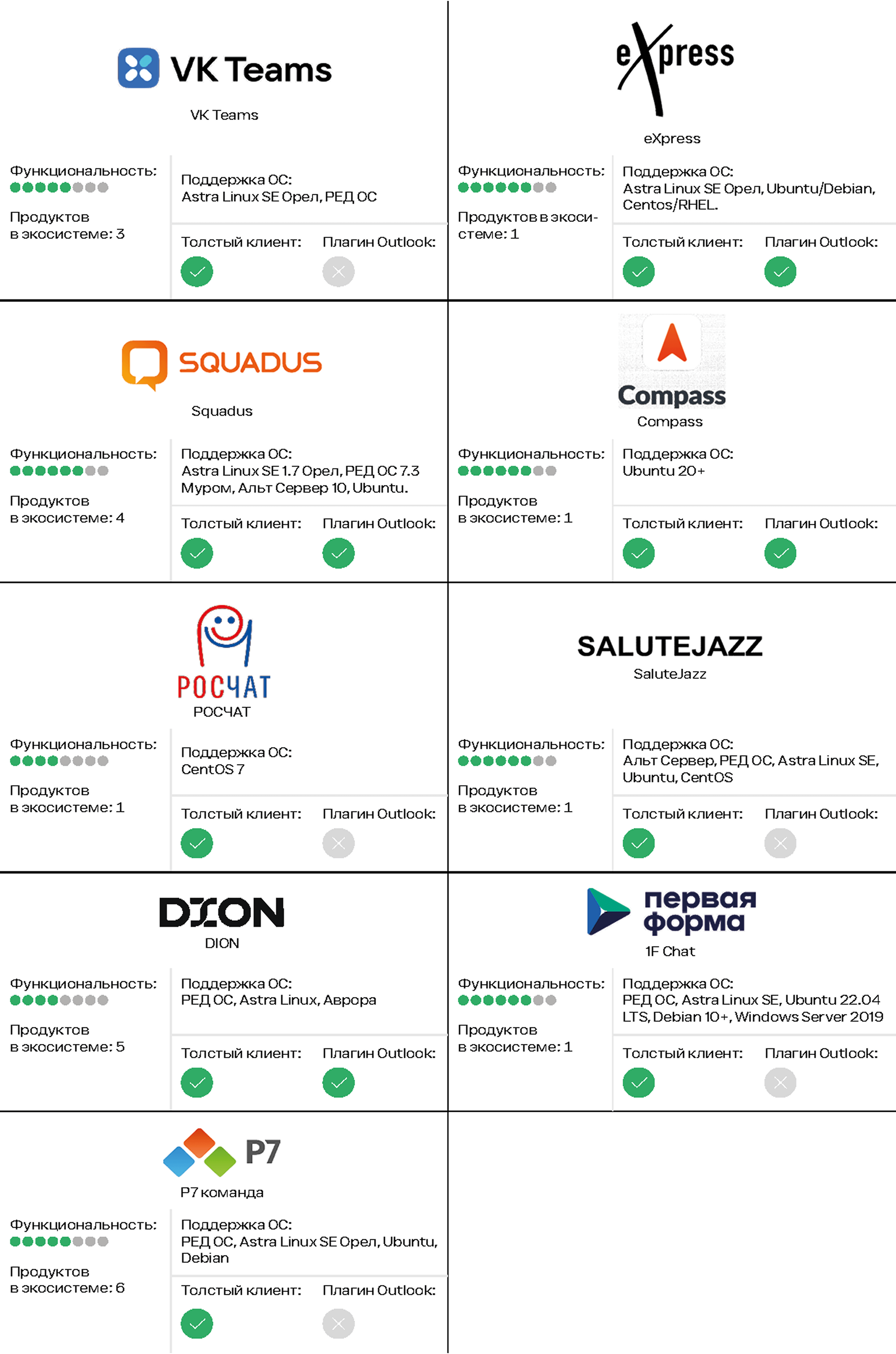 Решение | MS Teams | VK Teams | eXpress | Squadus | Compass | РОСЧАТ | SaluteJazz | DION | 1F Chat | Р7 команда | Яндекс 360 для бизнеса |